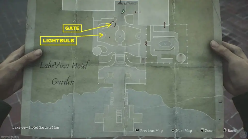 Go to the garden and use the bolt cutter to cut the chain on the gate at the location shown in the picture below. Now proceed ahead and get the Light Bulb from the sculpture at the location shown below.