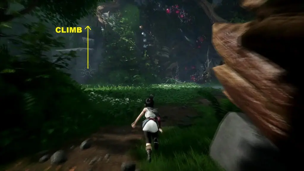 After entering through the gate, turn left and climb up the mountain wall as shown below.