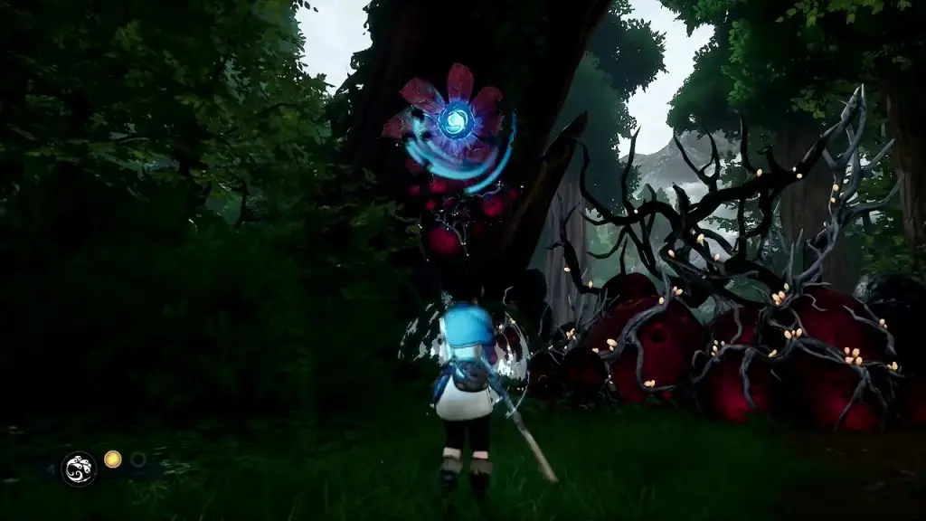 Move ahead and you will reach another area with a teardrop. Shoot the blue crystal on the tree and a waterdrop will fall on the tear making plant grow from it. Summon the tear from the plant and use it to clear the corruption to clear the path.