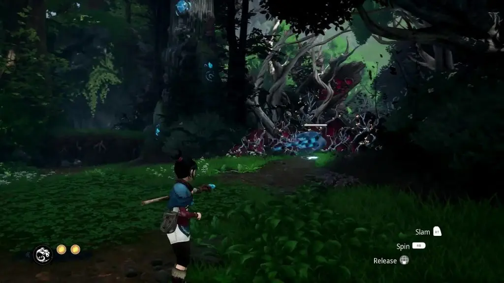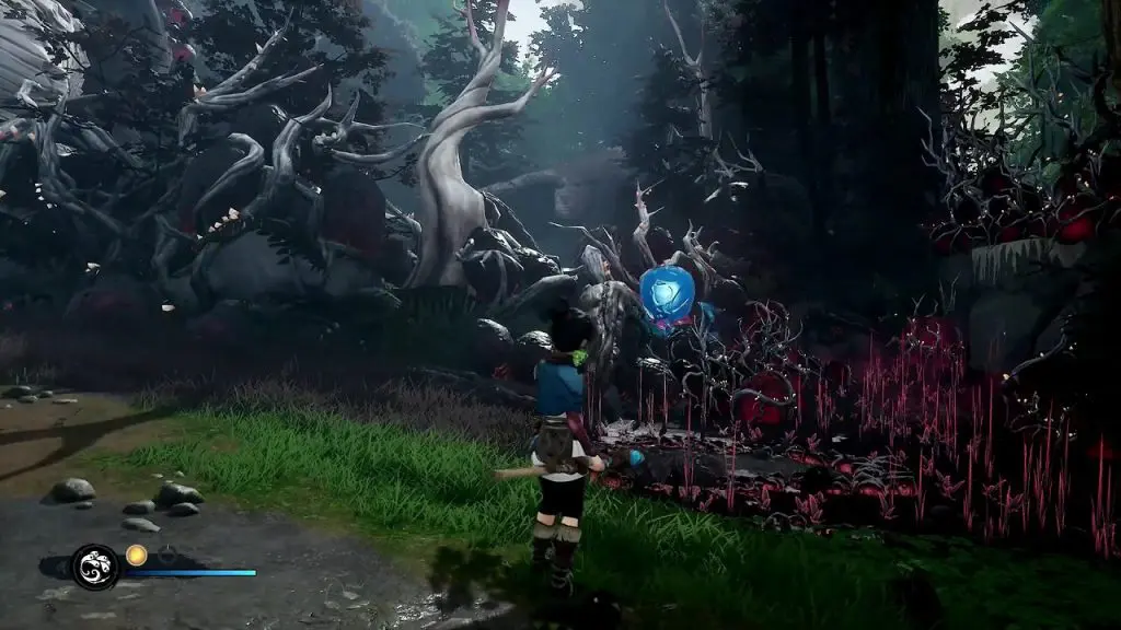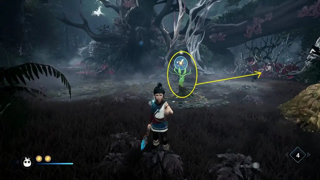 After climbing the wall turn right. You will find your path blocked by corruption. Destroy the blue bulb on the tree next to it to clear the corruption and move ahead.