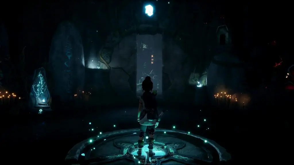 Go ahead in the unblocked path and jump down to reach the underground area. Slide down to the bottom. At the end of the path, you will find a switch on the floor. Stand on the switch and use pulse to open the door in front of you as shown below. Go inside and defeat the Shrine Guardian to complete the objective.