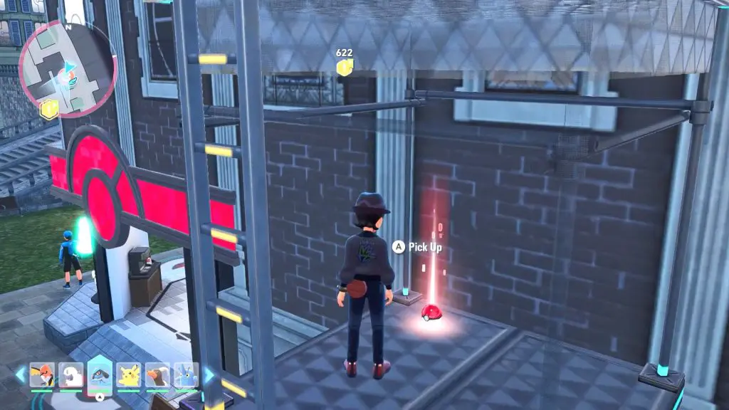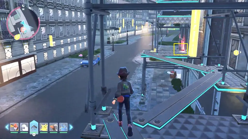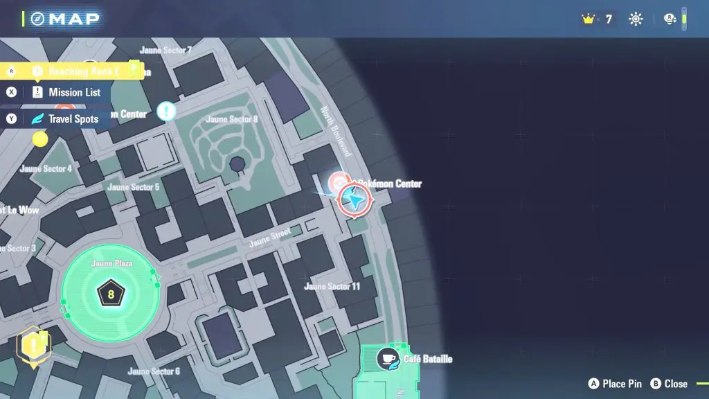 The Leaf stone can be found on the scaffolding on the side of the Pokémon Center building, located on the eastern side of the map. The building is situated southeast of Jaune Sector 8, at the intersection of Jaune Street and Northern Boulevard. To reach the stone, use the ramp on the bank of the building to climb up the scaffolding and collect it.