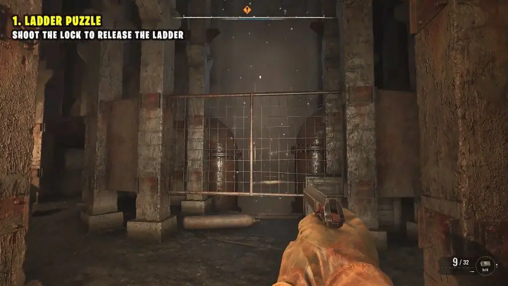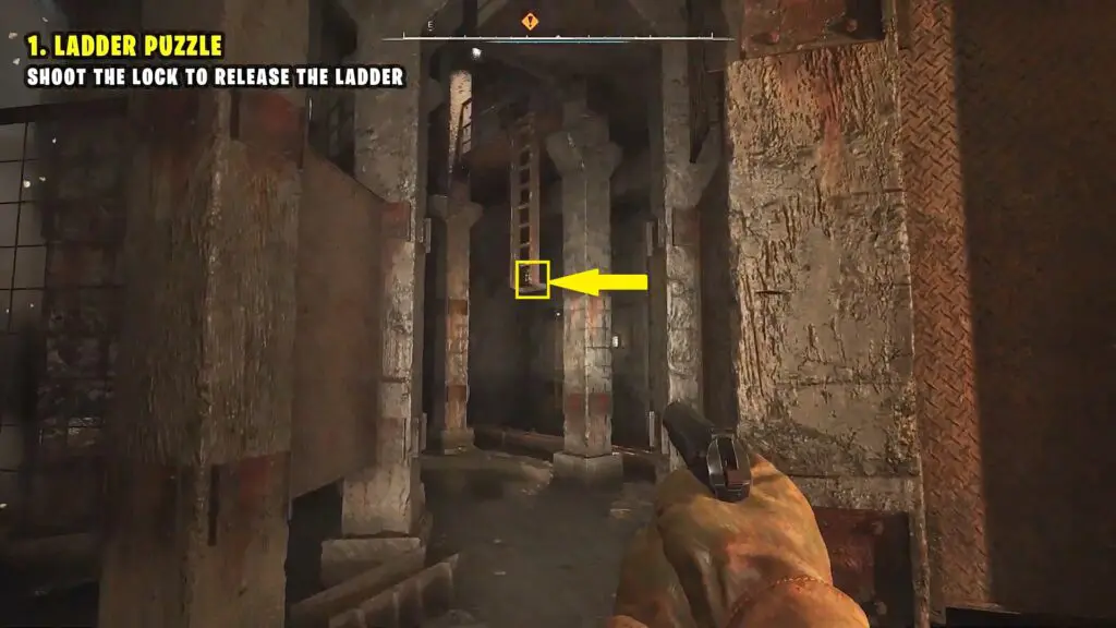 Progress in the area until you reach the room with air blowing up in the center as shown in the picture below. Here you will have to shoot the lock on the ladder as shown in the second picture below for the ladder to come down. Climb up the ladder and proceed ahead.