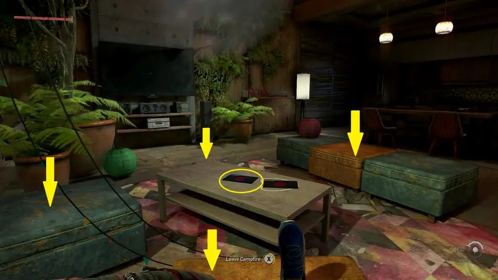 Now go to the room with a TV. Sit on the 4 chairs in the room marked with yellow arrows in the picture below. Rest on the final chair for some time, until a blueprint appears on the table in front of you as shown in the picture below. This blueprint is for Korek Charm, which gives infinite durability to weapons.
