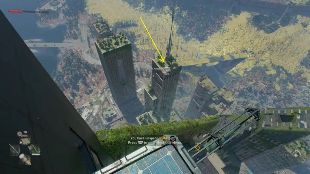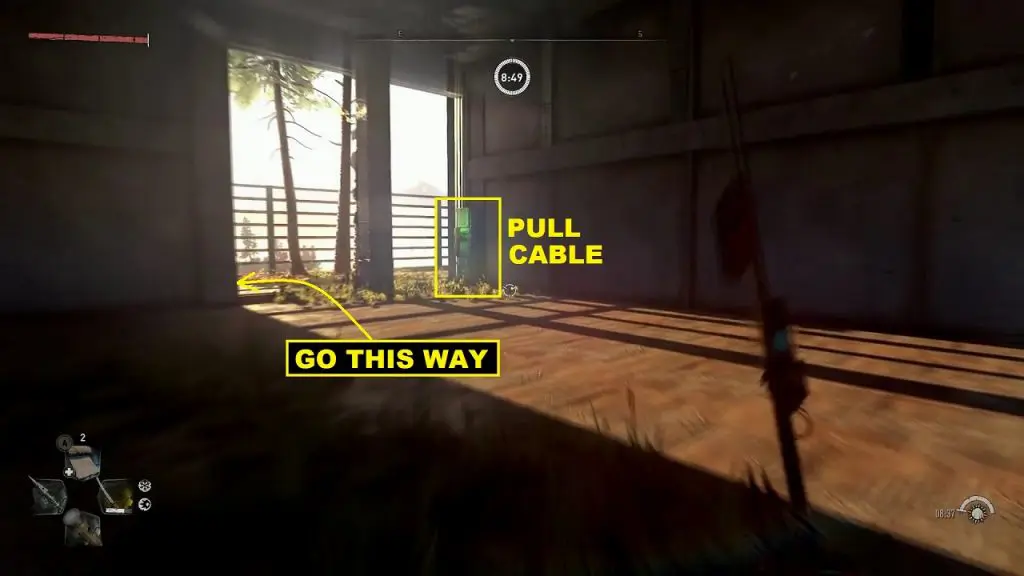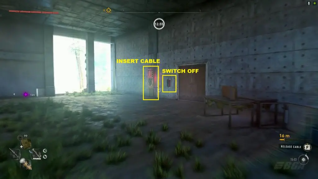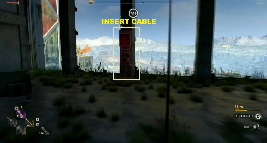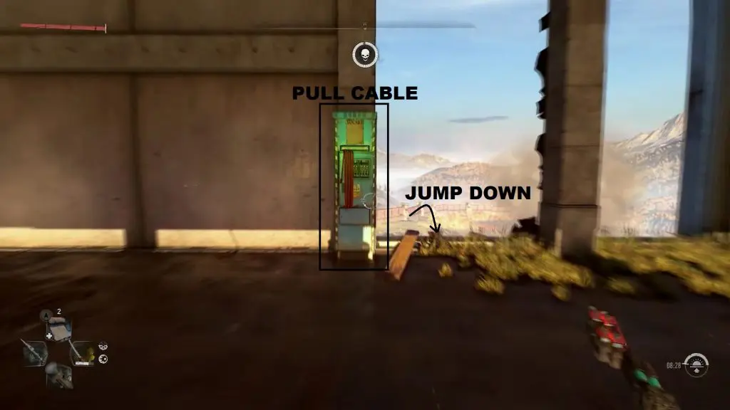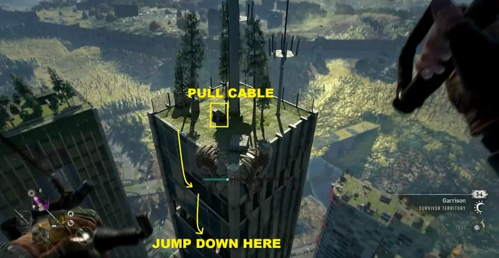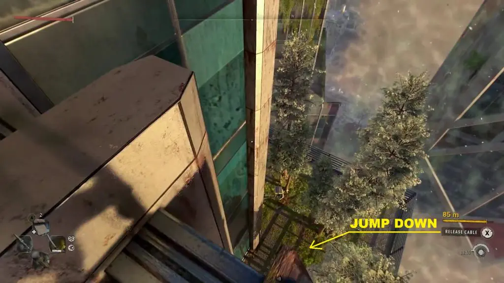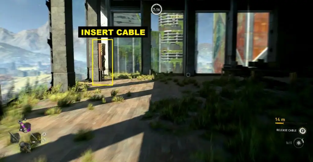 On this roof, pull the cable from the green terminal. Then drop down two levels below as shown in the picture below.