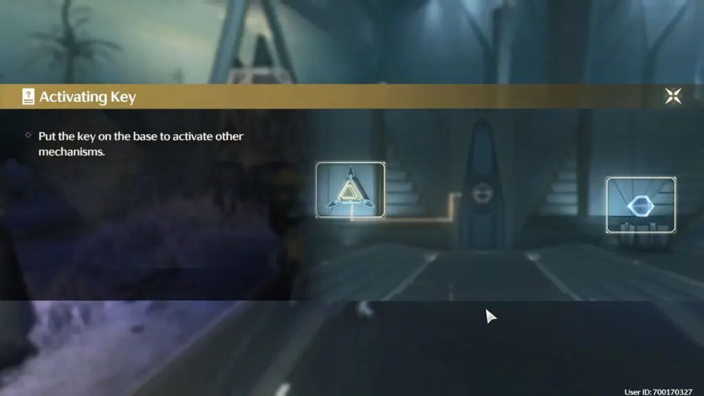 To exit the room, the player needs to place the white transparent crystal (Key) on the base to activate the mechanism. Pick up the crystal from the right side of the door and place it on the base on the left side to open the door.