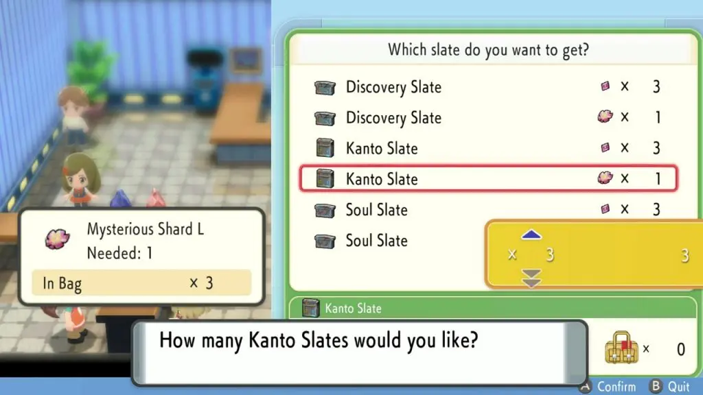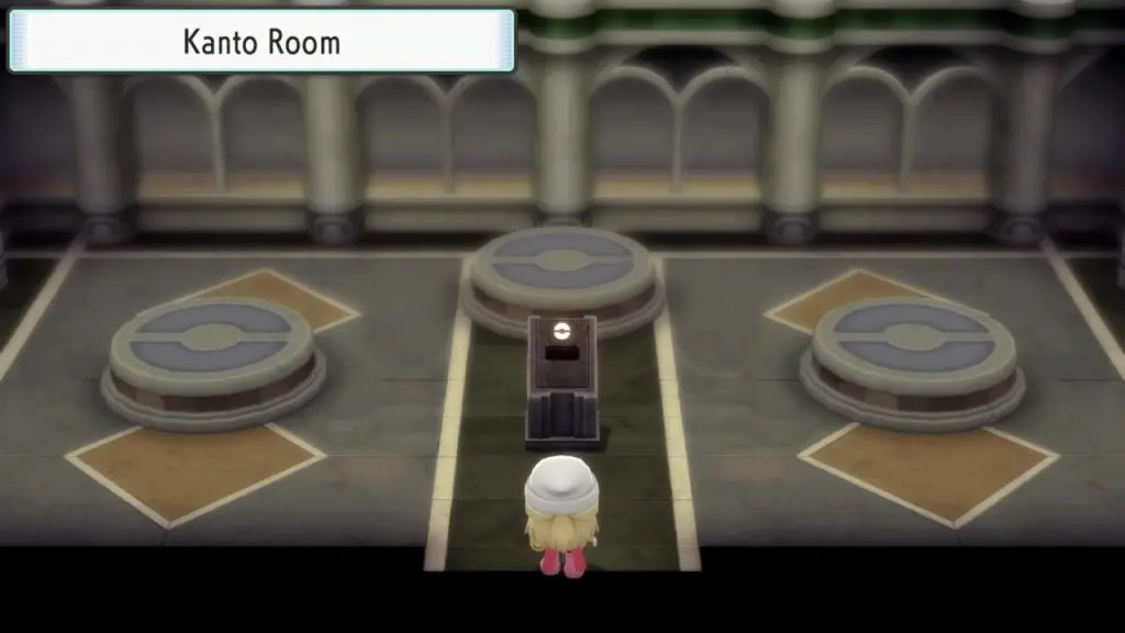 Once you have Registeel, Regirock, & Regice, go back to the Grand Underground and search for 1xMysterious Shard L or 3xMysterious Shard S. Then go back to Ramanas Park and purchase Kanto Slate. Now go through the door on the other side of the room and enter the Kanto room in Ramanas Park. Place the slate on the pedestal in the Kanto Room as shown in the picture below. This will make Legendary Dog/ Bird appear depending on the game version you have. Keep repeating the process again to get the remaining two Pokemon.