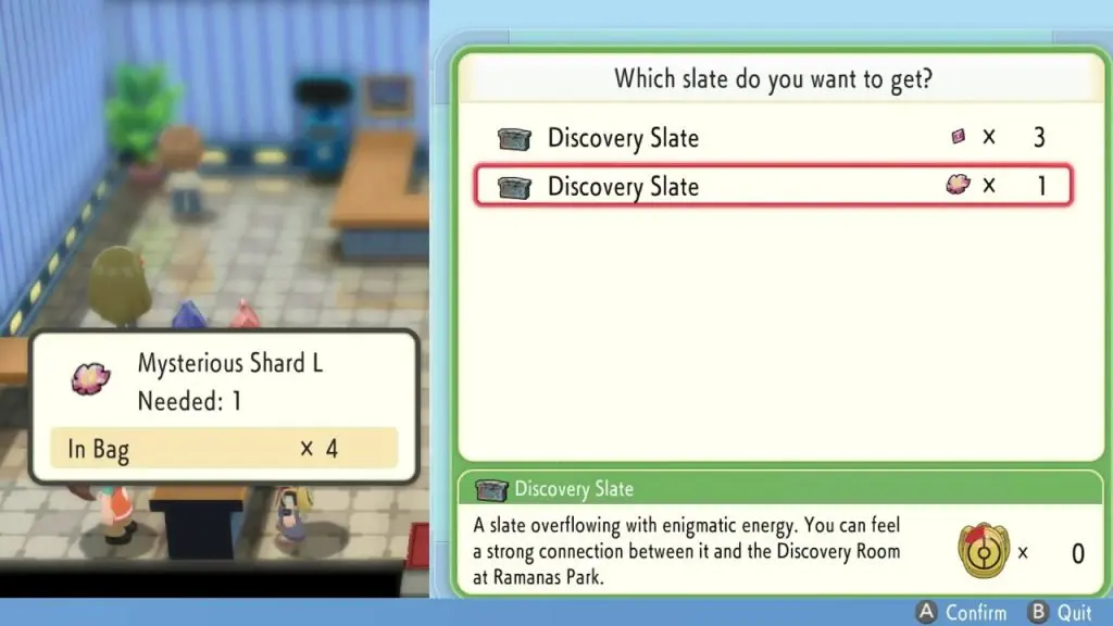 Go to the Ramanas park on Route 221 as shown in the picture below. Enter the building and go to the lady on the left side and purchase a Discovery Slate in exchange for 1xMysterious Shard L or 3xMysterious Shard S.