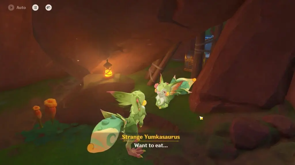 Talk to the strange Yumkasaurus, but you won’t be able to understand it. So to communicate with the Yumkasaurus try to feed it by offering raw meat/fish.
