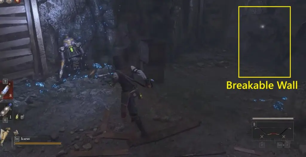 Once you reach the bottom, move left to find a non-functional robot. Just beside it, you’ll spot a weak-looking wall that can be destroyed.