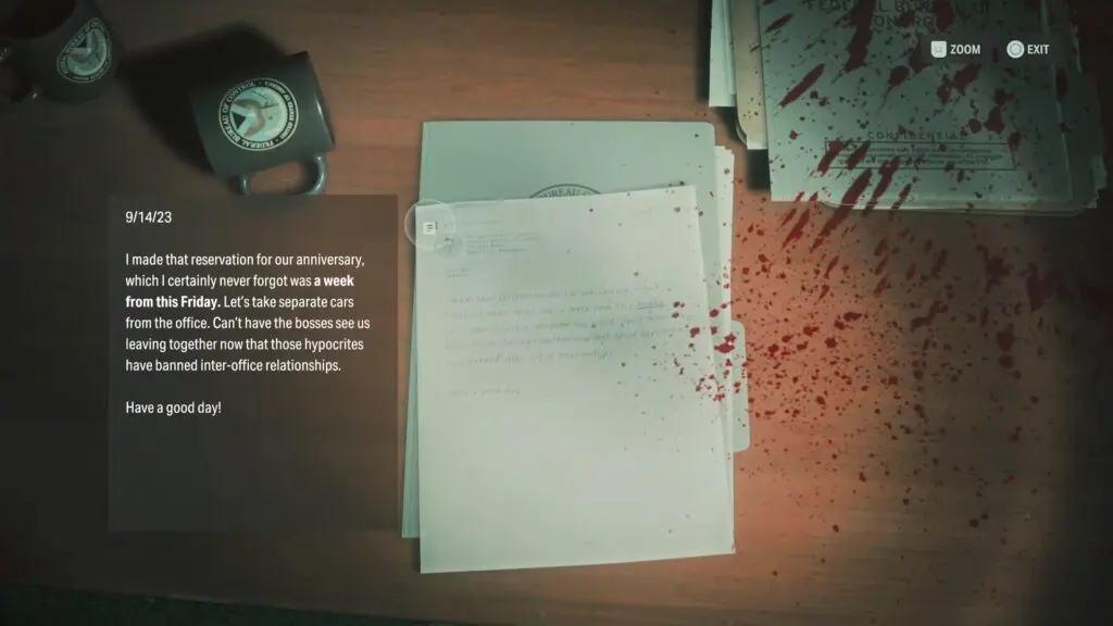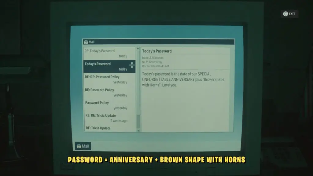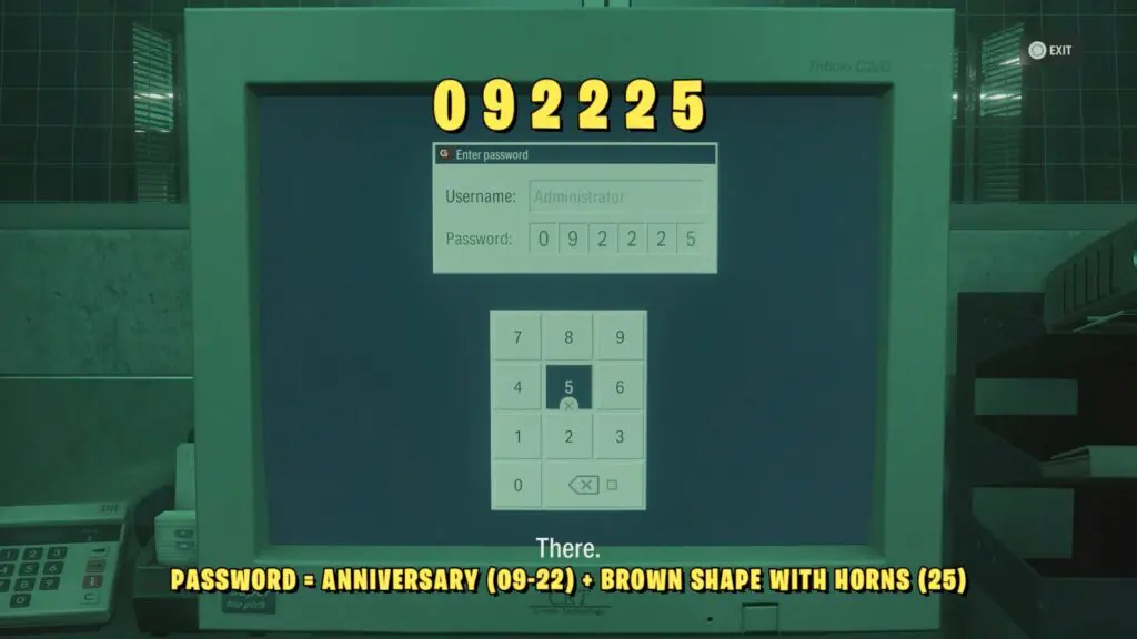 Use the Clearance Level 2 keycard to unlock the door on the northern side. Inside, you’ll find a locked computer that requires a 6-digit password. The password is a combination of two employees’ anniversary dates and a few extra numbers related to one of Rudolph Lane’s paintings.