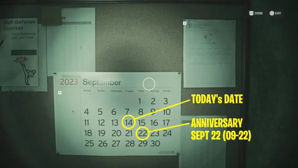 The note gives the clue that the anniversary is “a week from Friday” the week of September 14, 2023. By checking the calendar on the wall, you’ll find the correct date: September 22. So the code is 0922.
