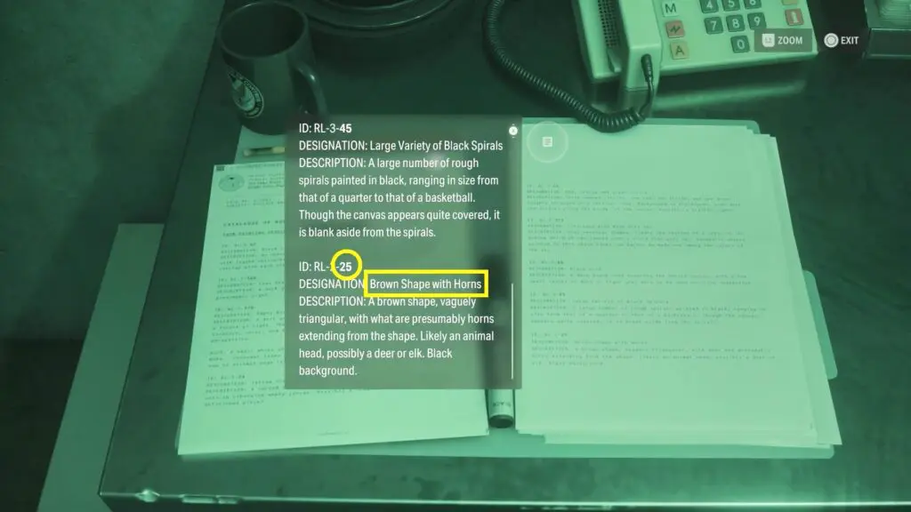 The last two digits of the code refer to the “Brown Shape with Horns” painting, which is a list of paintings near the computer and the number is 25.