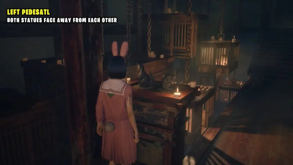 In this puzzle, you’ll come across two rabbit statues and two fox statues, each placed on separate tables. The statues act like dials, and you’ll need to carefully rotate them so that all of the nearby cages are perfectly leveled. When the cages align, they’ll unlock and allow you to collect the lantern shades inside. Once you have the shades, place them on the hanging lights in the room. Doing this will cause the puzzle to be completed and reveal the key in front of the cage.