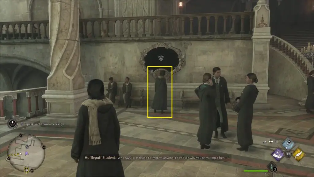 After completing Charms Class and Defence Against the Dark Arts Class main quests, talk to Lenora in the central hall as shown in the pictures below to start the quest.