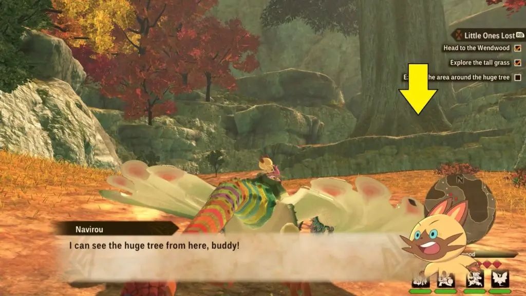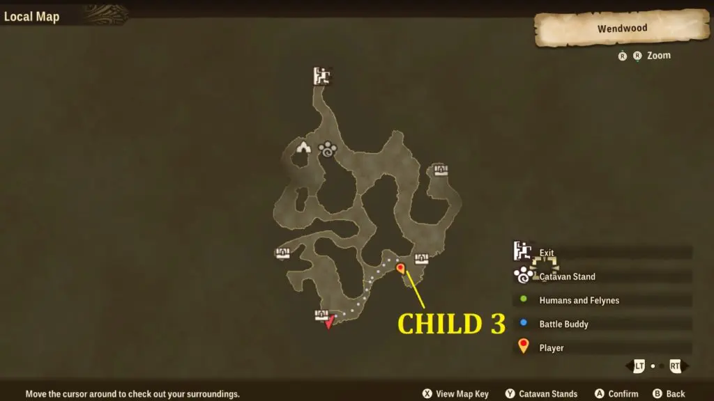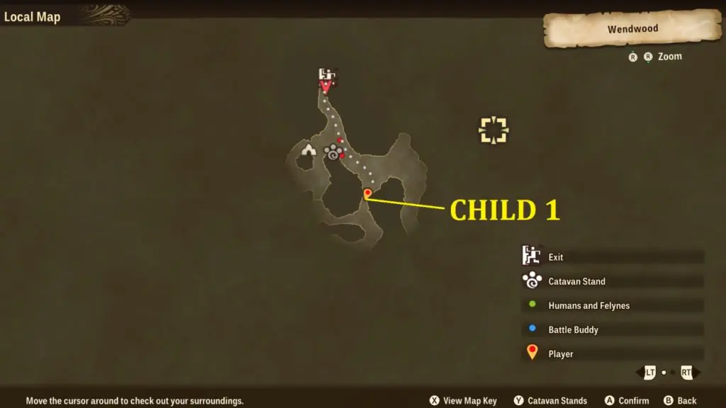 The first small hint that the game gives players is to “explore the tall grass.” A lot of the grass in Wendwood looks very similar, so this guide will go over how to find the first kid in the tall grass. From the entry point go straight and take the second right there you will find the first child sitting in front of a mountain wall with Ivy stem tendrils. You can find this little kid in the location shown on the map in the picture below. Talk to the first kid and he will give you clue to find the others. She will give information that last time all three kids were together near the huge tree.