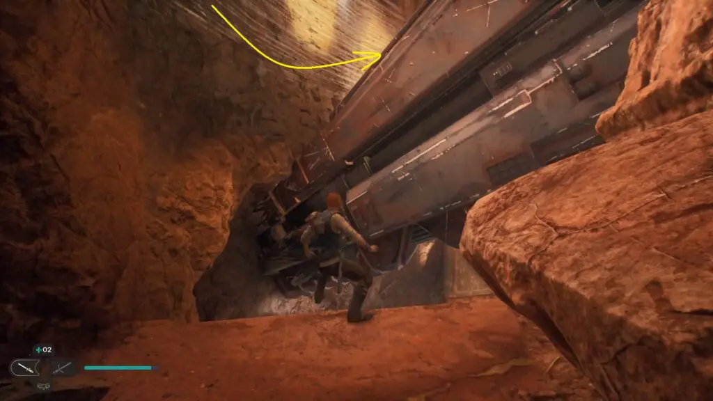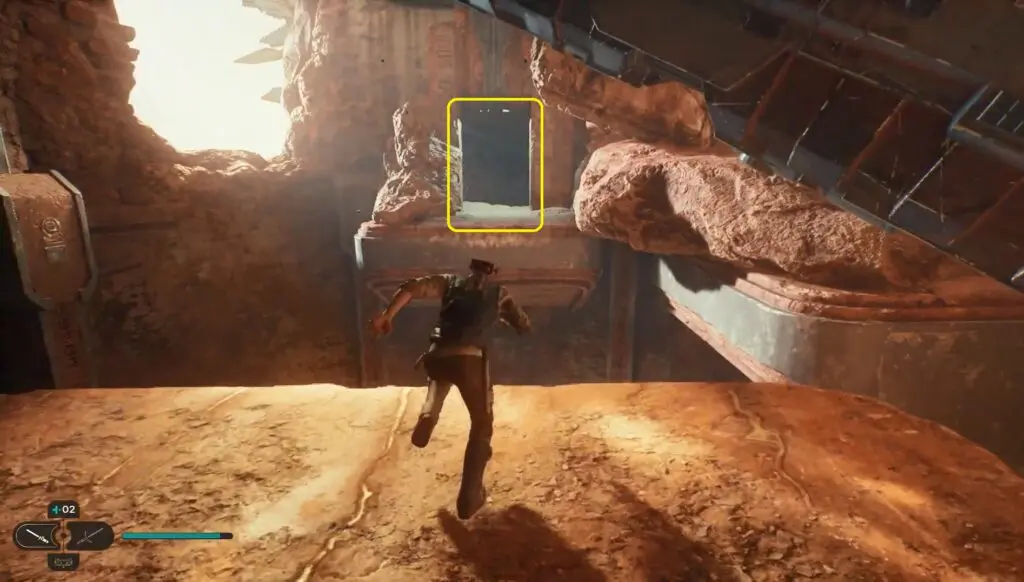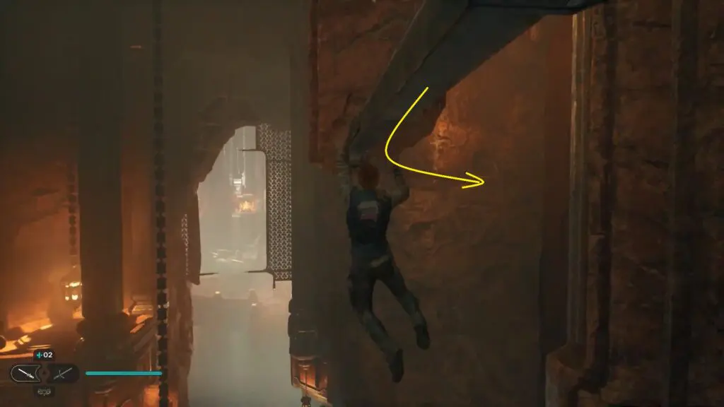 Take the left path and squeeze through another wall path. Hold onto the iron beam and proceed forward. Then perform a wall run to reach the opposite ledge.