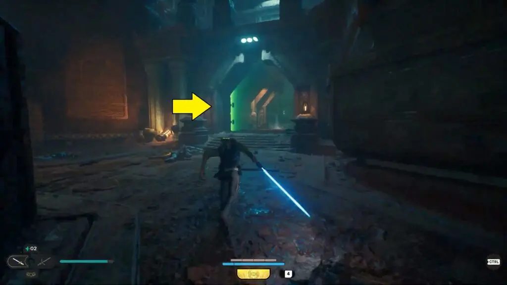 Defeat the enemies at the bottom and proceed to the green barrier door. The next section involves a series of jumping and climbing that take you to an area of the ruins that requires swimming.