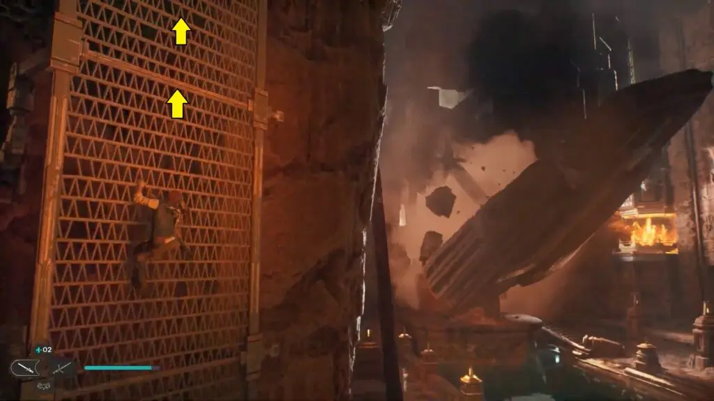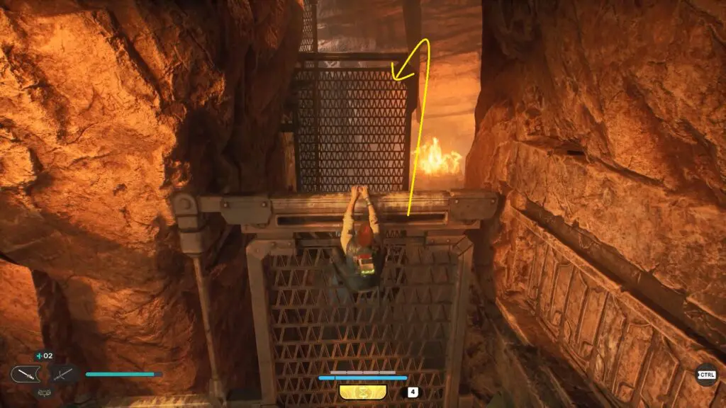 Continue forward while holding on to the iron beam to reach the next grill panel.