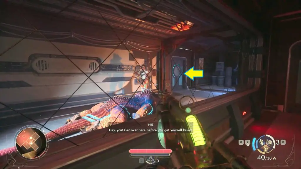 Enter the building through the main door and reunite with NPC Inze. Then go through the only open door.