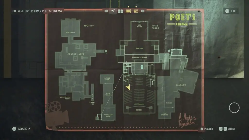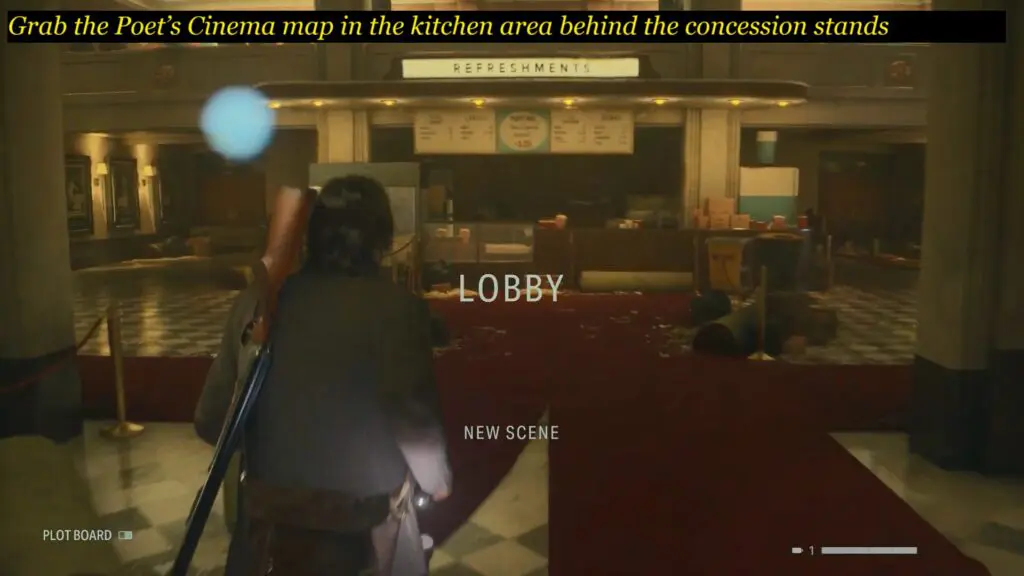 Head inside the Poet’s Cinema and then grab the Poet’s Cinema map in the kitchen area behind the concession stands in the Lobby area.