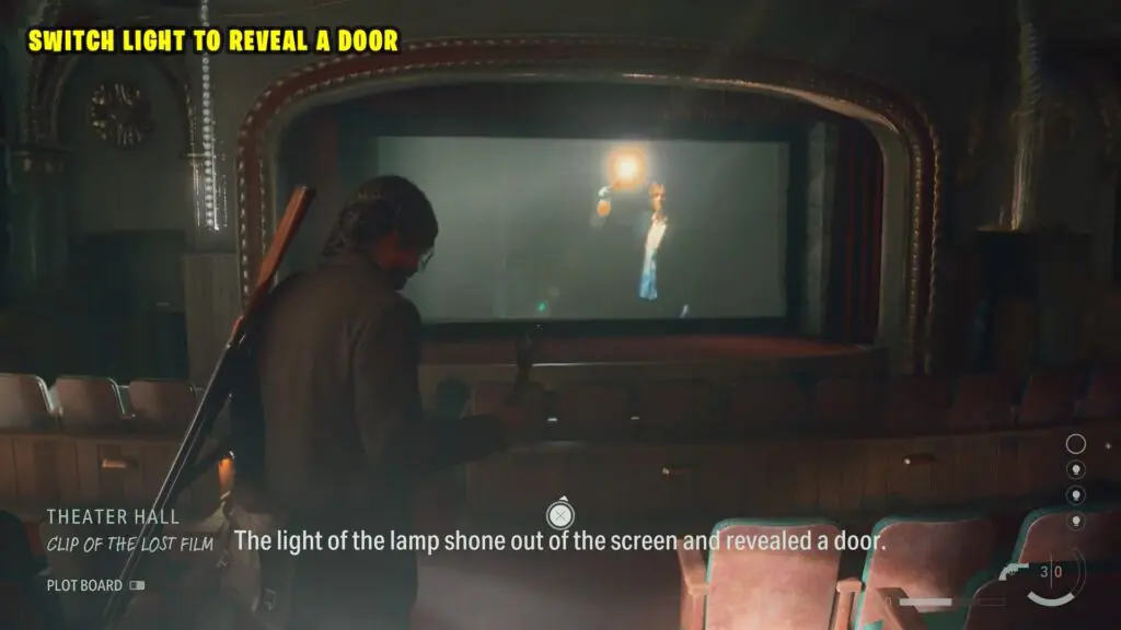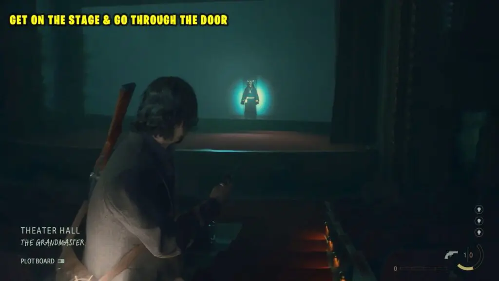 Head back to the Theater Hall and activate the Grandmaster scene. This triggers another movie to start, showing the Grandmaster entering a door. The goal is to move towards the stage and interact with the door on the screen, which will enable Alan to magically transport to a completely different location.