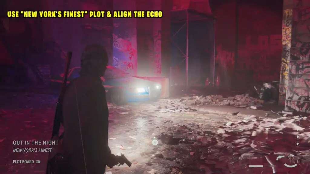 Upon reaching the backyard, switch the theme to “New York’s Finest” and align the Echo. You’ll spot a police car, and by utilizing the Angel Lamp, you’ll observe that its headlights direct your attention towards a doorway but some obstacles block this section.