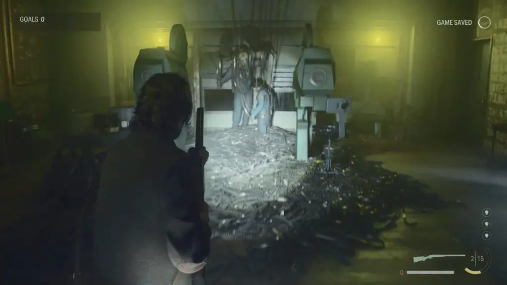 As you proceed toward the dead-end, retrace your steps, and you’ll eventually find yourself back in the “normal” projector room. There, you’ll discover two police officers who have met unfortunate ends, and one of them is wearing the Moose Skull Mask.