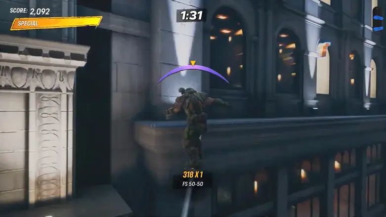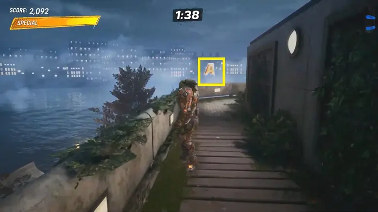 After collecting the letter ‘A’, grind along the edge of the rooftop until you reach a wire that stretches back to the previous building. Grind the wire and jump up to collect the next letter.
