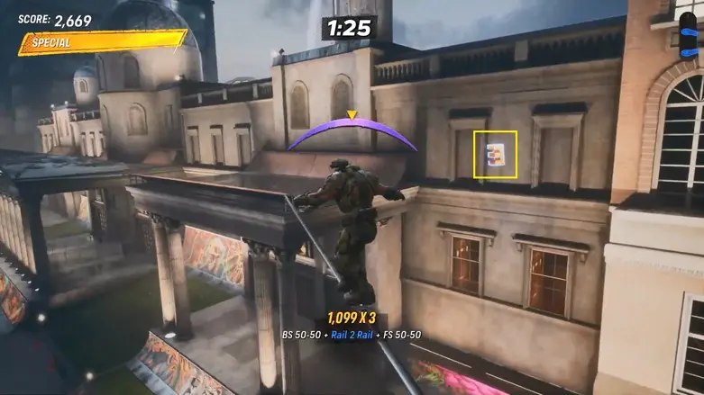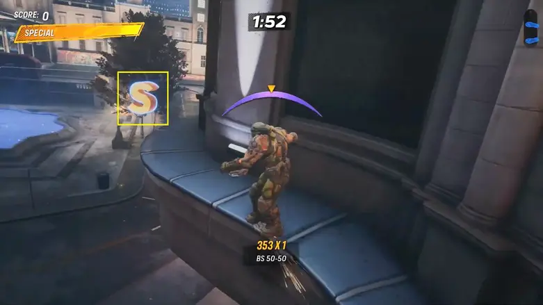 From the starting point, look to your left and you’ll see a store called “Depop” across the fountain. The letter S is on the ledge above the store. Use the nearby quarter pipe to jump up, then grind along the ledge to the left to collect the letter.