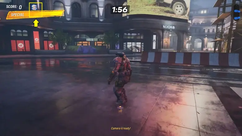 After collecting the letter ‘S’, keep grinding along the same ledge, then jump onto the wire that leads to the building on the right side (not the one that crosses the road). You’ll find the letter ‘K’ on the rooftop.