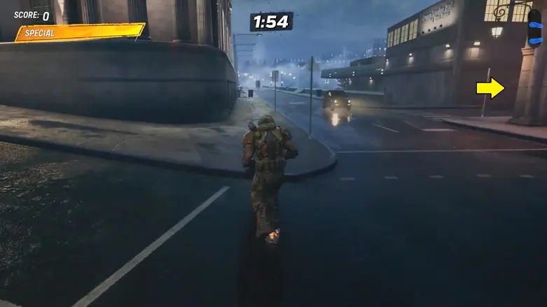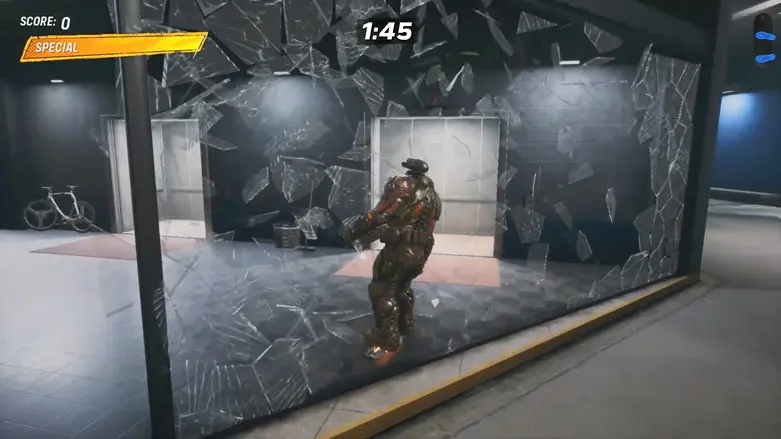Inside the car park, break the glass and go into the elevator. It will take you to the top, and then you’ll automatically drop down to the ground. While dropping, you’ll collect the hidden deck along the way.
