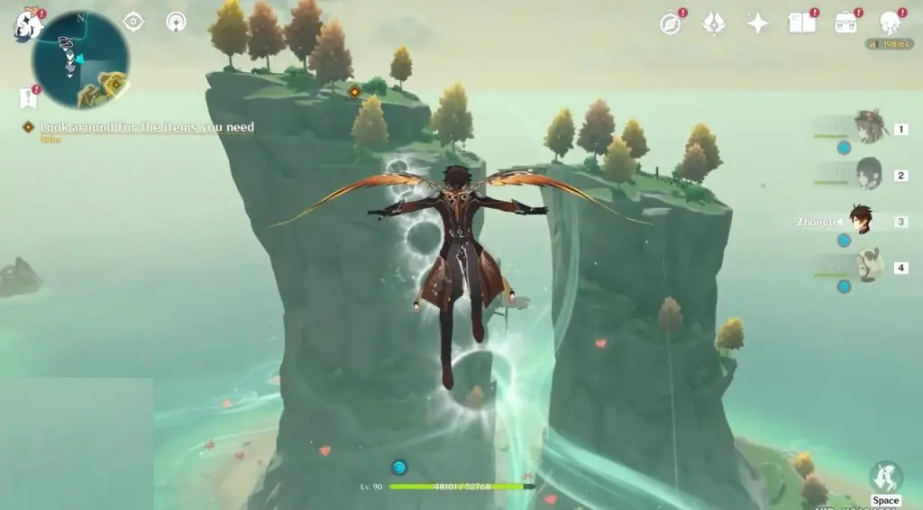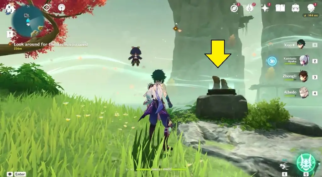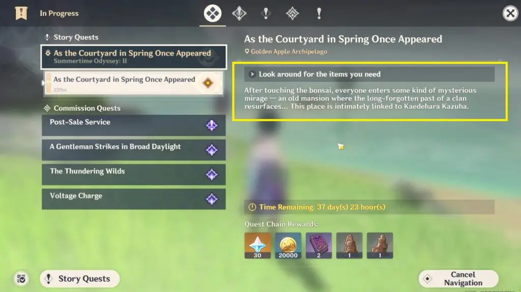 This guide shows you how to complete the objective “Look around for the items you need ” of the Story Quest “As the Courtyard in Spring Once Appeared” for Day 2 in Golden Apple Archipelago of Genshin Impact 2.8. This objective is available after you find Kazuha behind the last door in Domain 1.