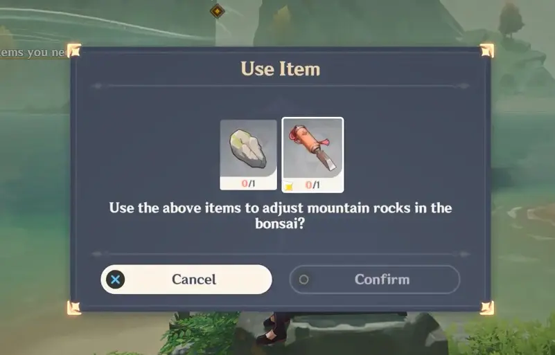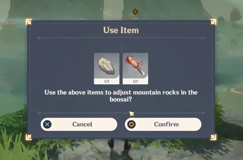 In this part of the game, you need to place some items on the mountain rock to adjust the bonsai.