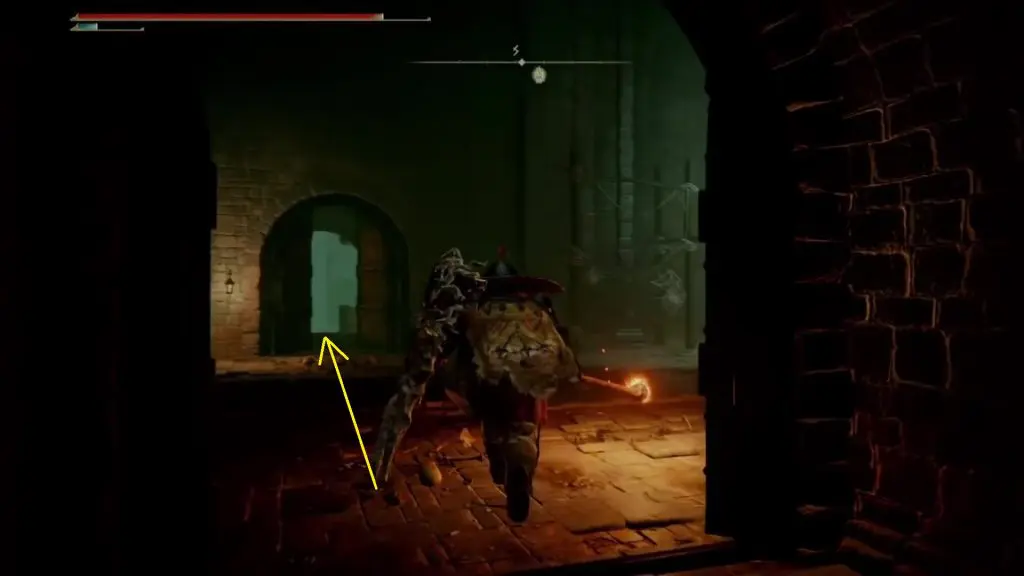 Proceed ahead and enter the hallway on the right. After coming out of the hallway, go down the stairs, then turn around as shown below and go through the iron gate. This will take you to a tunnel.