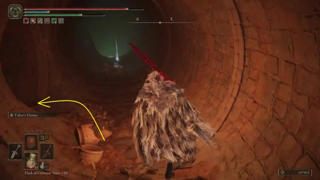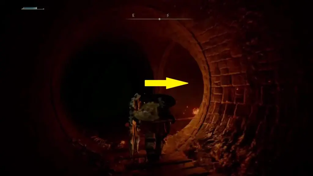 Go through the pipe and enter the first connecting pipe on the left side as shown below. This pipe is easy to miss as it is right after a left turn and due to the darkness.