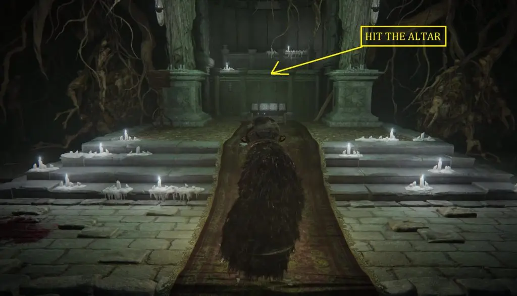Now proceed ahead in the downward direction. Get down the ladder when the pipe ends. then turn right and take the elevator to the lower level. Here you will find a site of grace. Proceed straight ahead to reach Mohg the Omen boss lair. defeat the boss and then hit the altar as shown below. This will make the altar go down, revealing a hidden path.