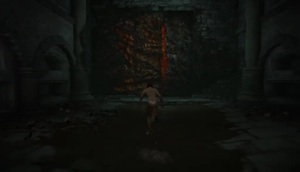 At the lowest level, you will find a Site of Grace and you will also see a burning door. Unequip all your weapons, armor, & items. Then interact will the door ahead as shown below. After a cutscene, you will get branded by the Frenzied Flame.