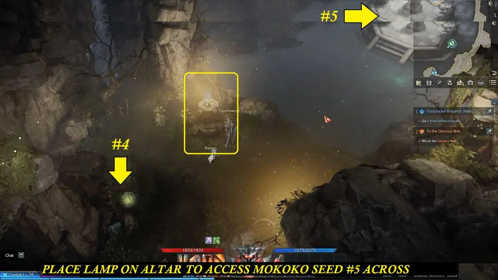 At the previous location, you will find an altar near Mokoko Seed #4. Place the lantern that you have collected previously near Mokoko Seed #2-3. This will create a path on the water leading to the Mokoko seed #5.