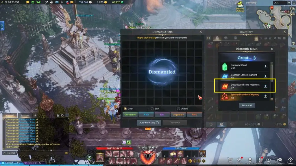 You will also receive Destruction Stone Fragments from dismantling the gears that you dropped while doing Chaos Dungeon and Guardian Raids.