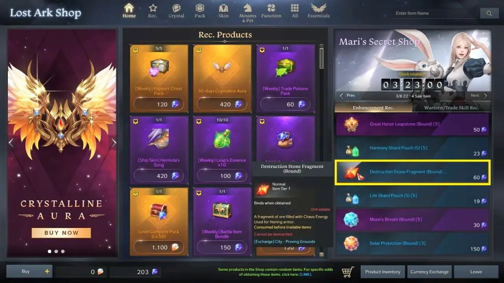 You can buy Bundle of destruction stones from Mari’s Secret Shop every 6 hours in return of blue stone.