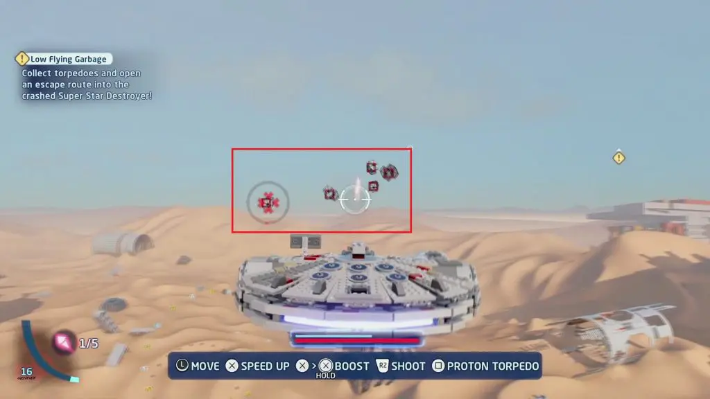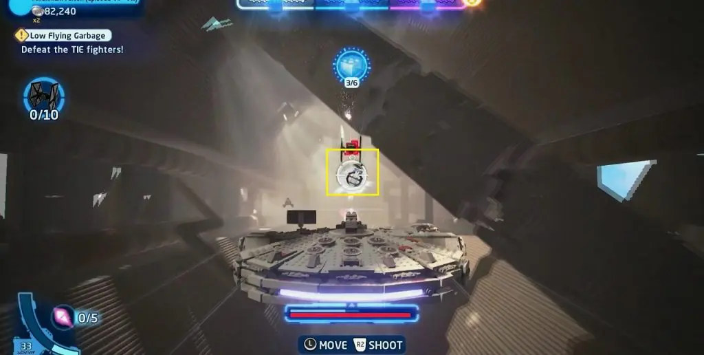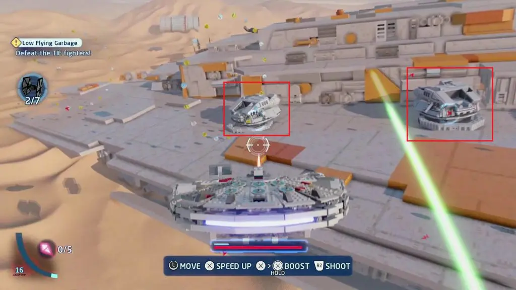 During the wave, you will be attacked by 5 TIE fighters as shown below. Destroy all the 5 TIE fighters to get the Minikit.