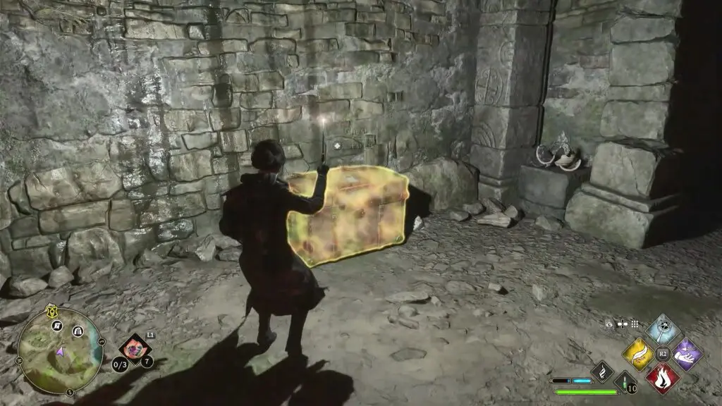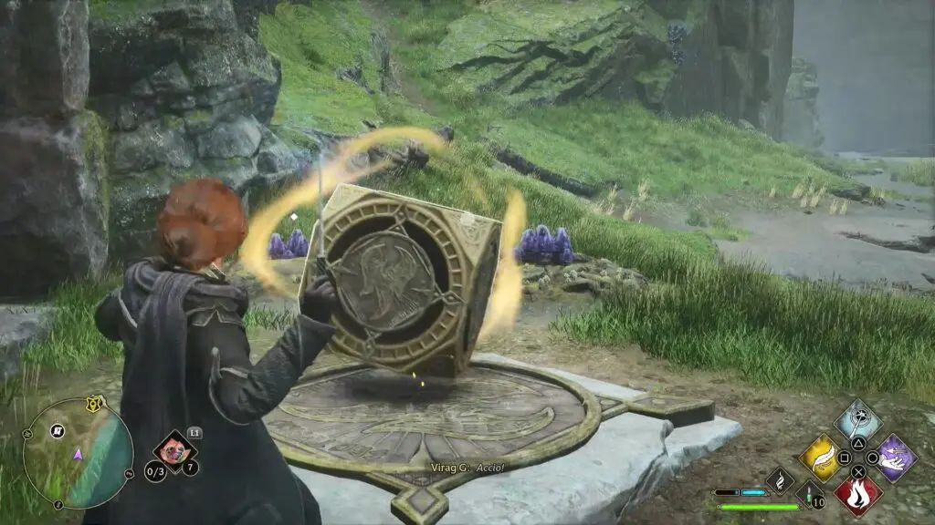 At the location, you will notice a big circle in the ground and a cube nearby. Use the Wingardium Leviosa or Accio spell to place the cube into the circle base.