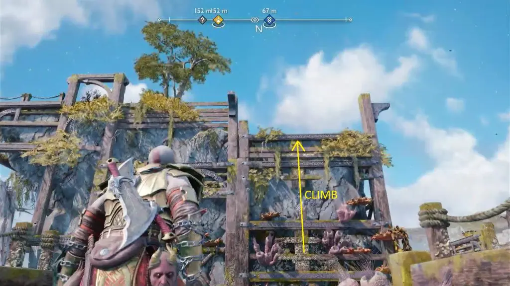Go back to the previous area. Then jump to the other side and climb up the wall on the right side as shown in the picture below. As you reach the top, turn right to find the lore marker as shown in the second picture below.