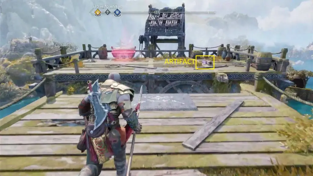 From the lore marker, turn around and climb up the wall as shown in the picture below. Then turn left and go till the end to find the artifact.