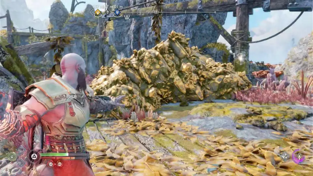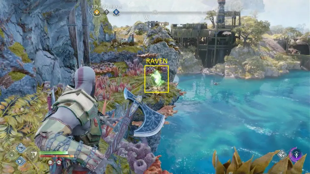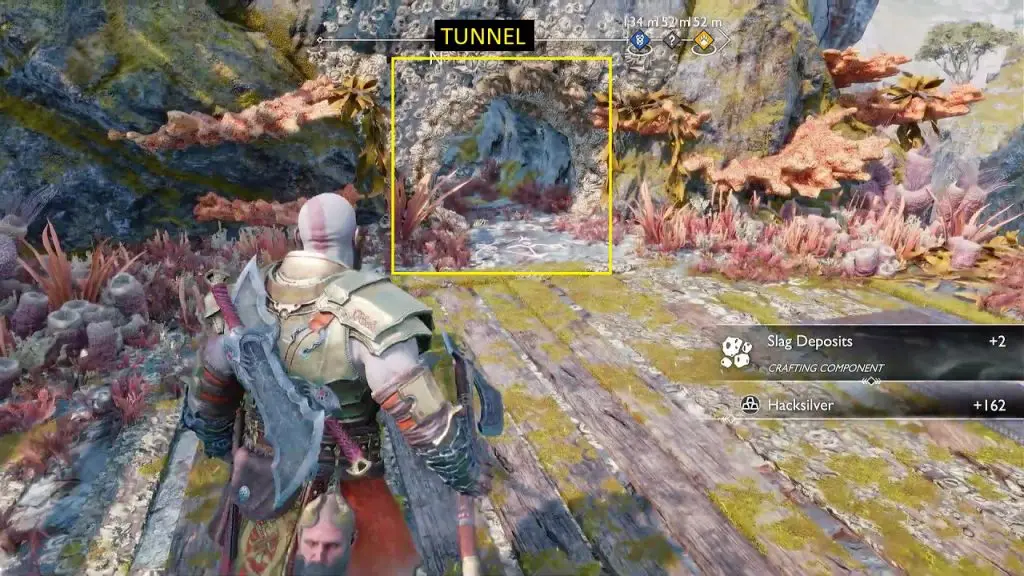 This will lead you to the chain that you used to reach the lore. This time, don’t use the chain. Turn left instead and throw the grenade on the gold ores as shown in the picture below. Then jump to the other side. Here, you will see a tunnel entrance on the right side as shown in the second picture below. Go through the tunnel. Then turn left to find the raven as shown in the third picture below.