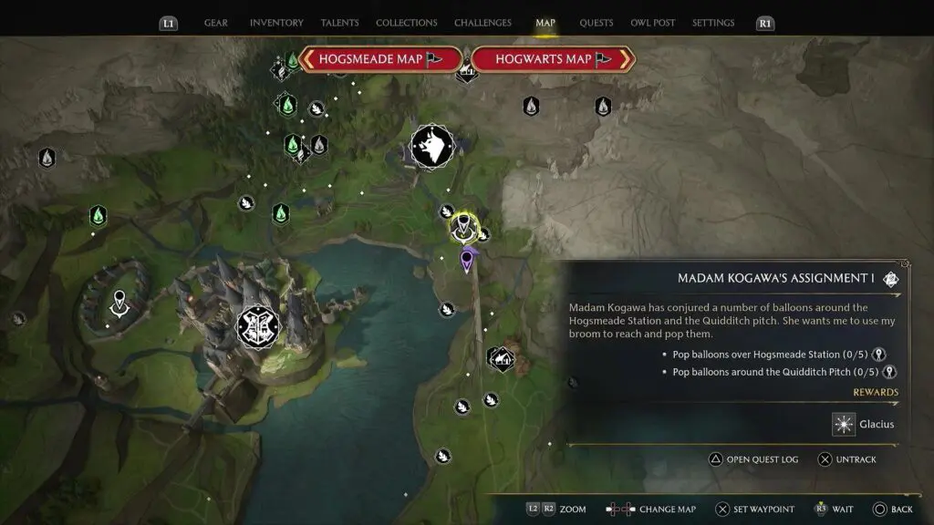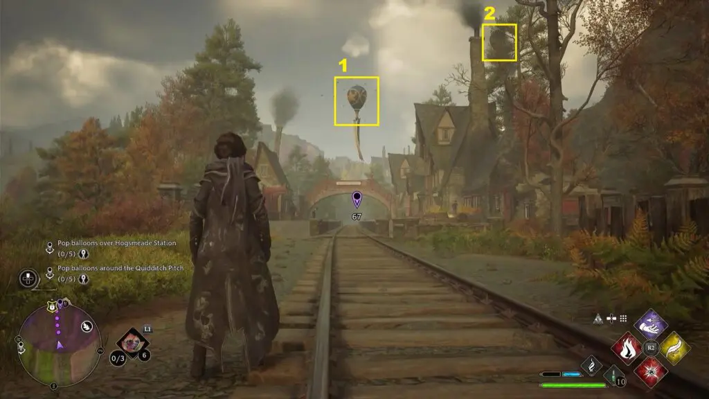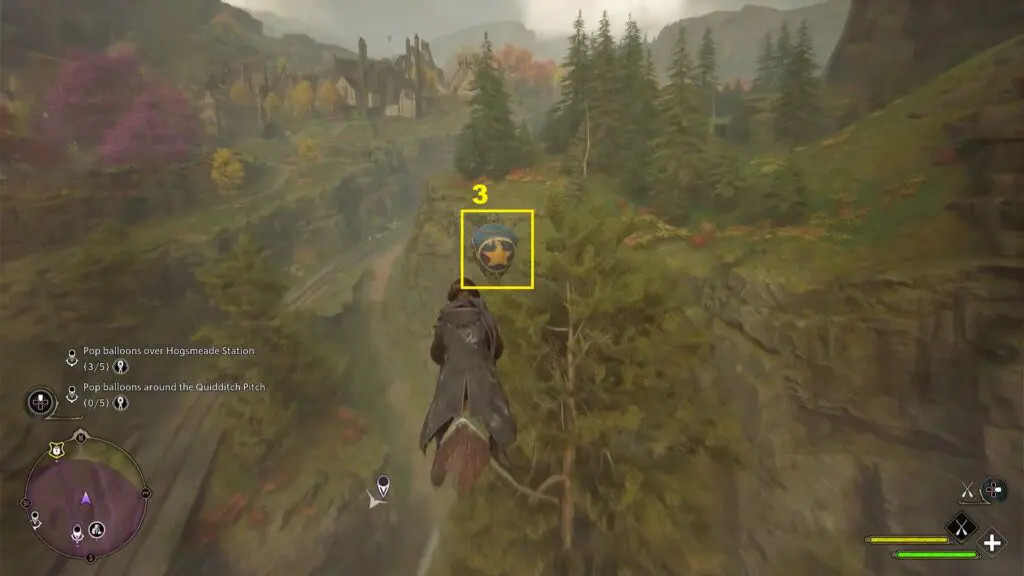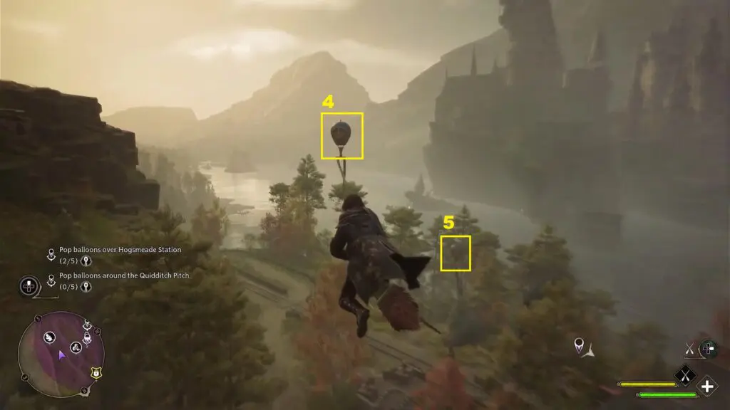Fly south from the Hogsmeade Station to find the fourth and fifth balloons as shown in the picture below. Pop all five balloons to complete the objective.