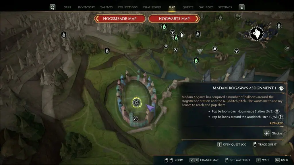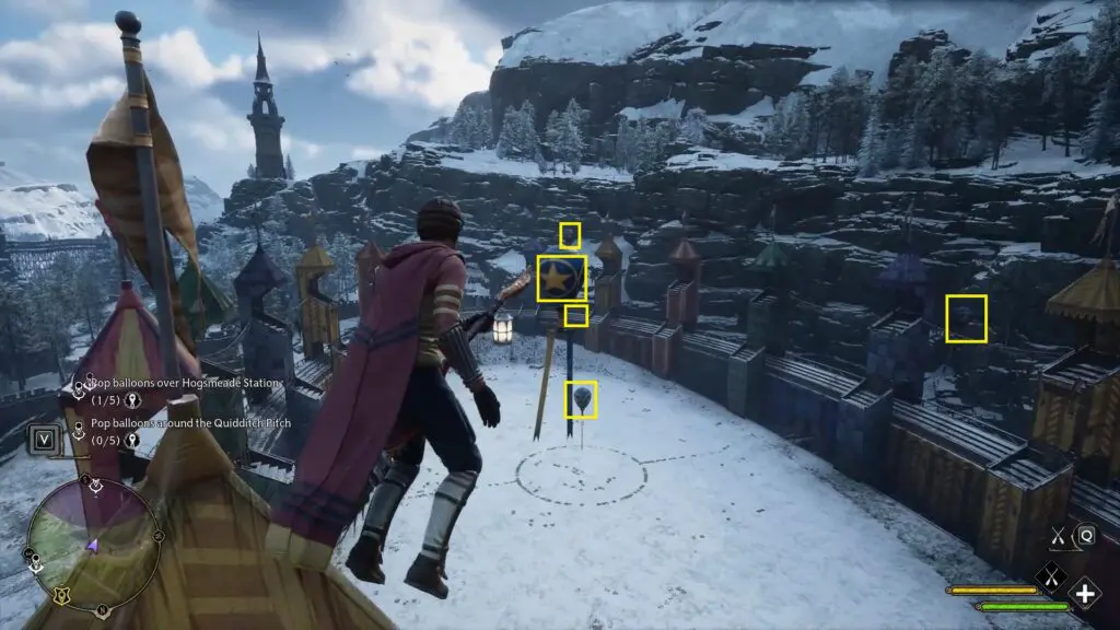 Go to the Quidditch Pitch and fully into the five balloons as shown in the pictures below to complete the objective.