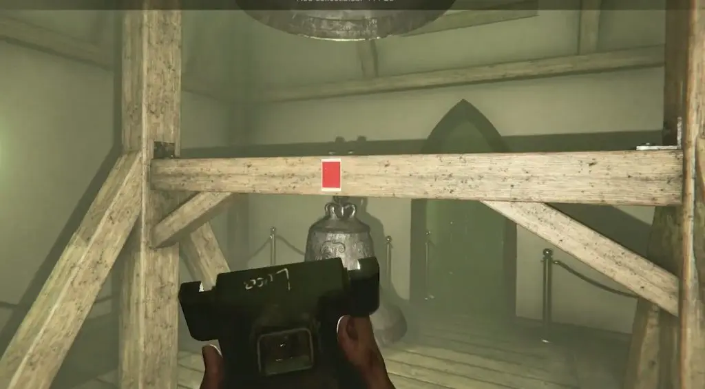 Time travel to 1987 in the cathedral area. A red photograph is on the ground close to a bench to the left of the confessional chamber.