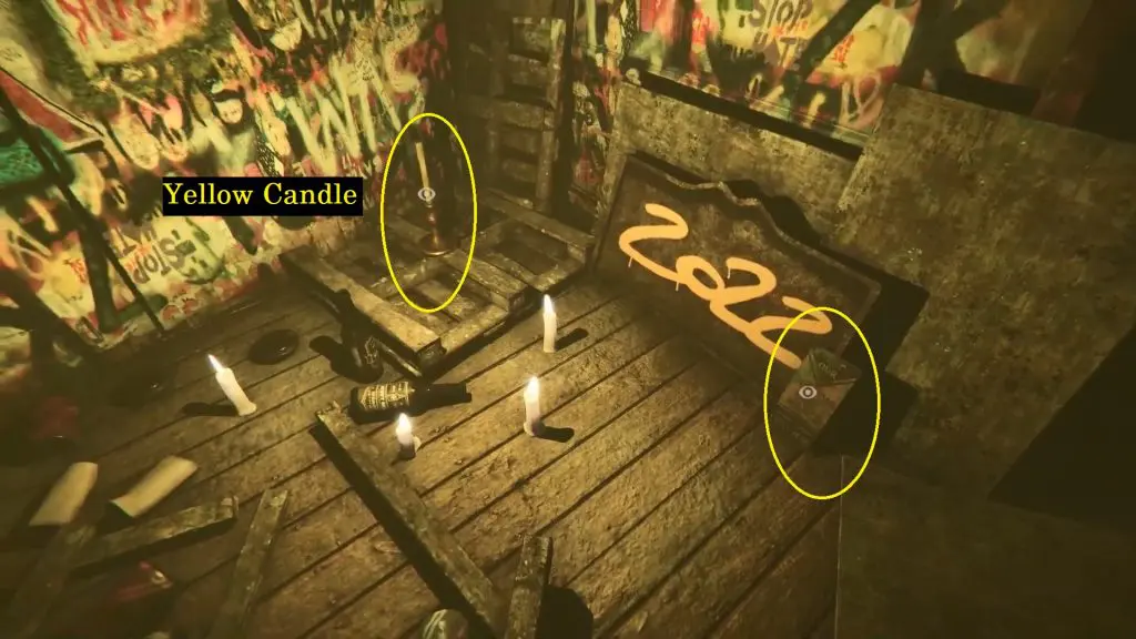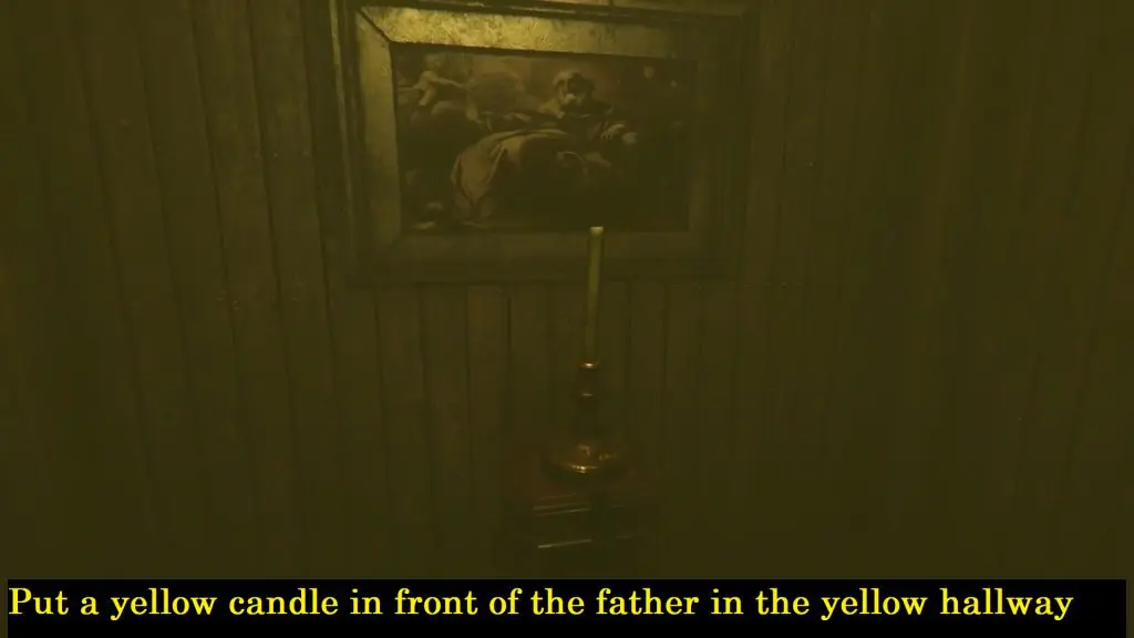 A yellow color maze (hallway) is on the left. Head inside and place the yellow candle on the pedestal in front of the father’s photo. As shown below image.